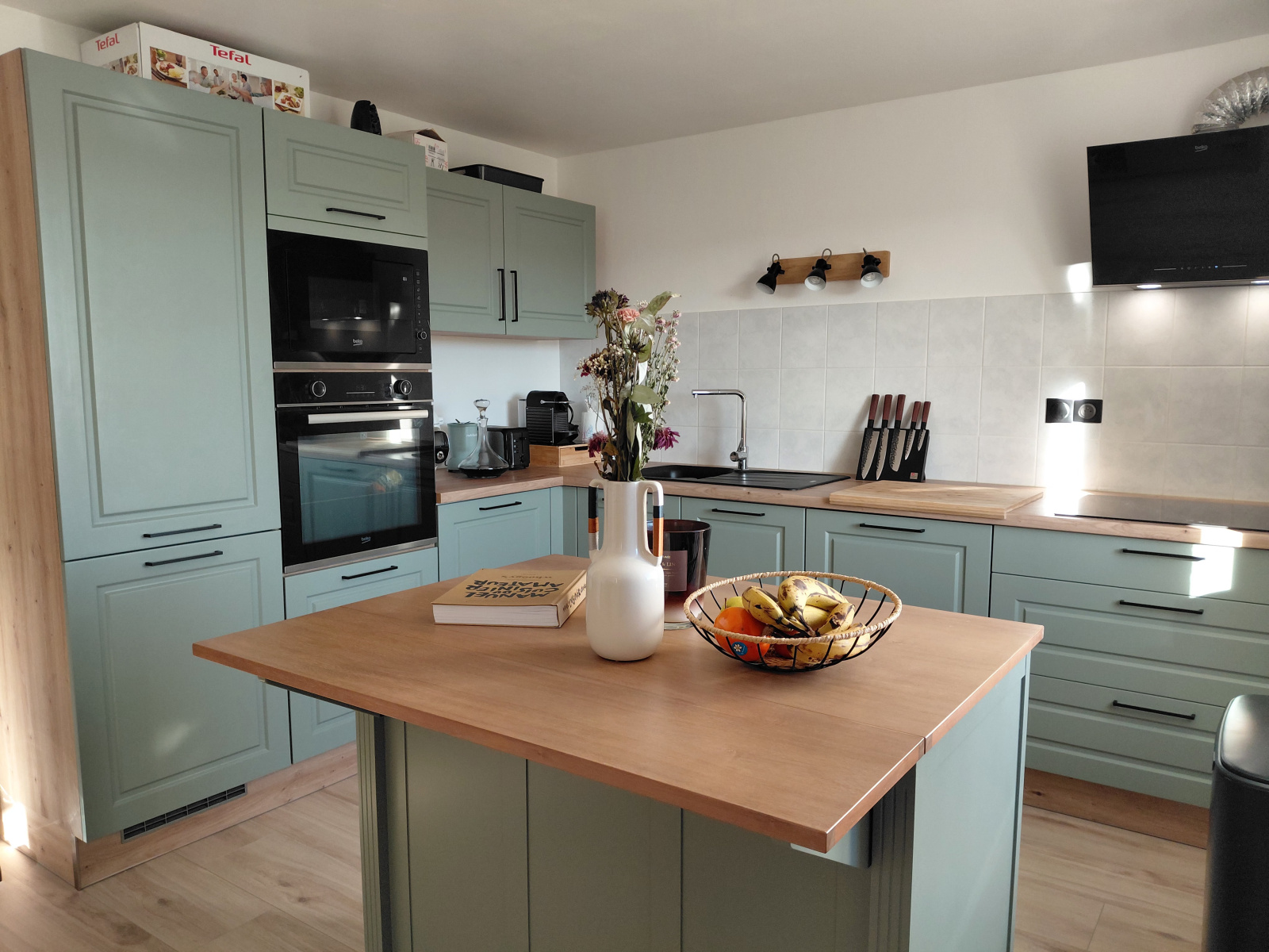 La cuisine fonctionnelle ouvre sur une pièce de vie lumineuse, offrant une vue imprenable sur la nature environnante.
