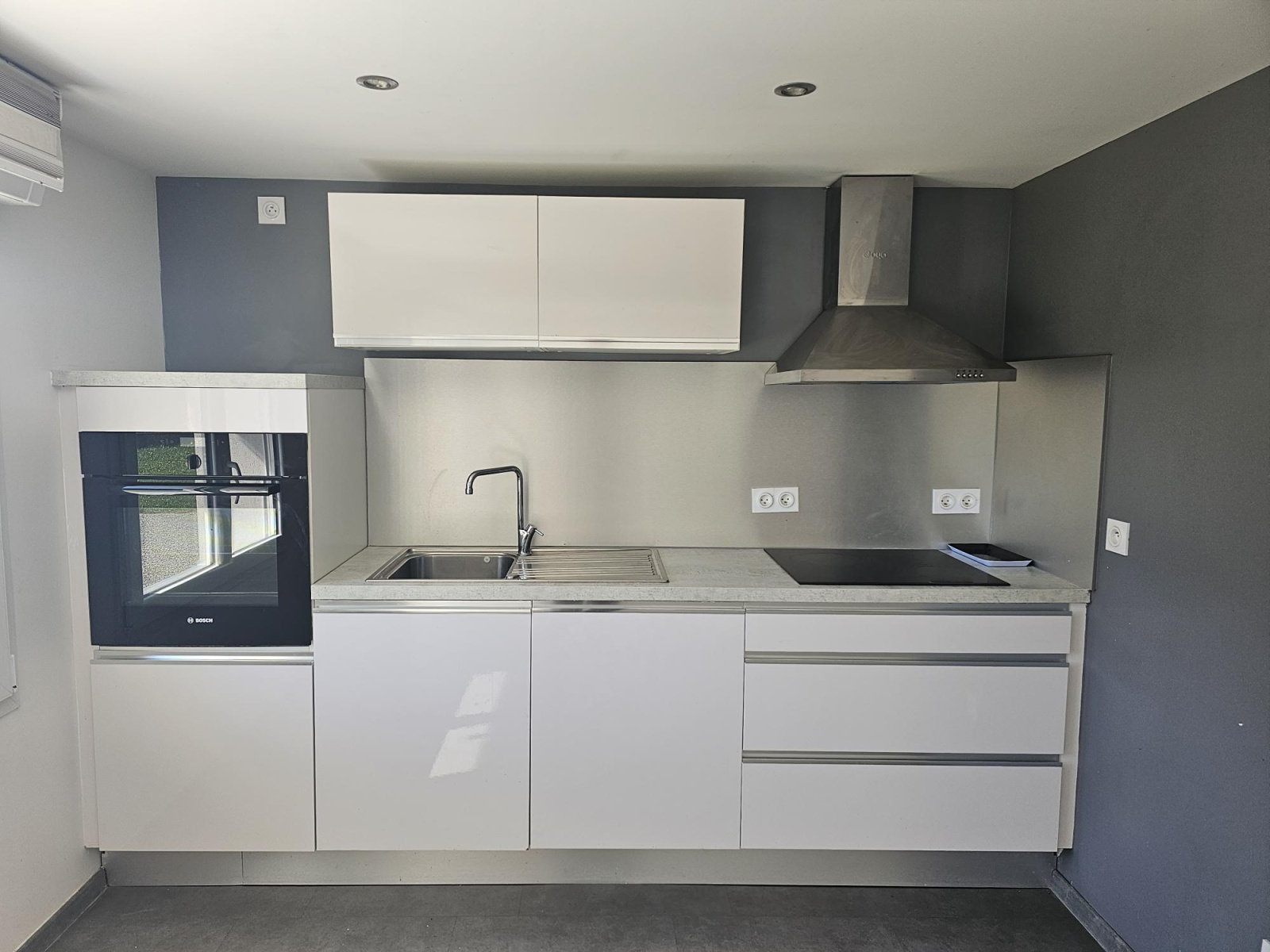 La cuisine est ouverte sur un salon/séjour baigné de lumière avec accès par une baie vitrée à la terrasse.