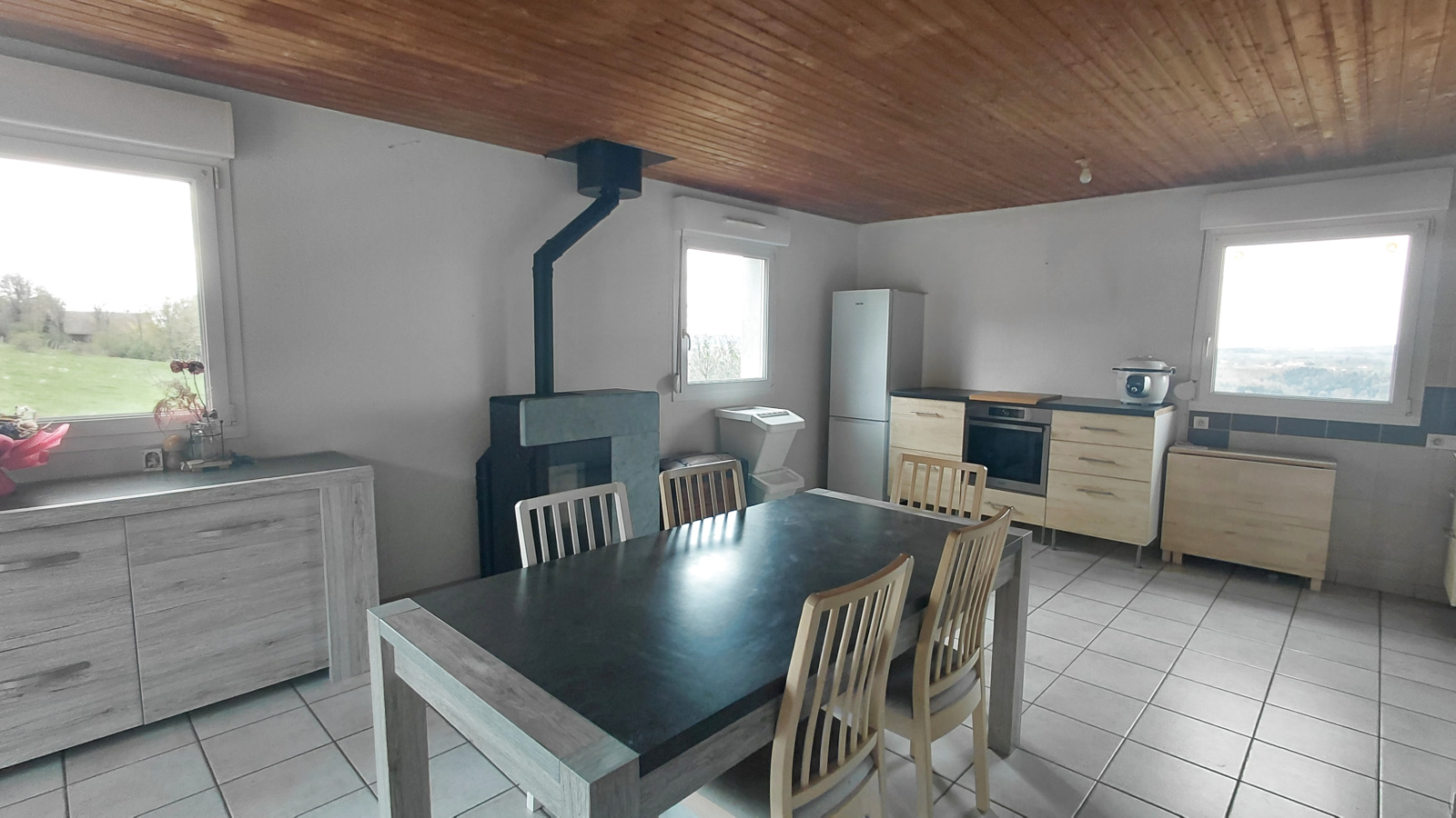 La visite commence d'accès plain-pied par une pièce de vie lumineuse comprenant la cuisine et le séjour avec poêle à granulés, puis un salon récemment aménagé, un cellier fonctionnel et un wc séparé.