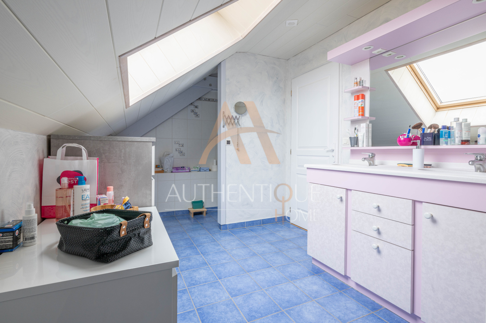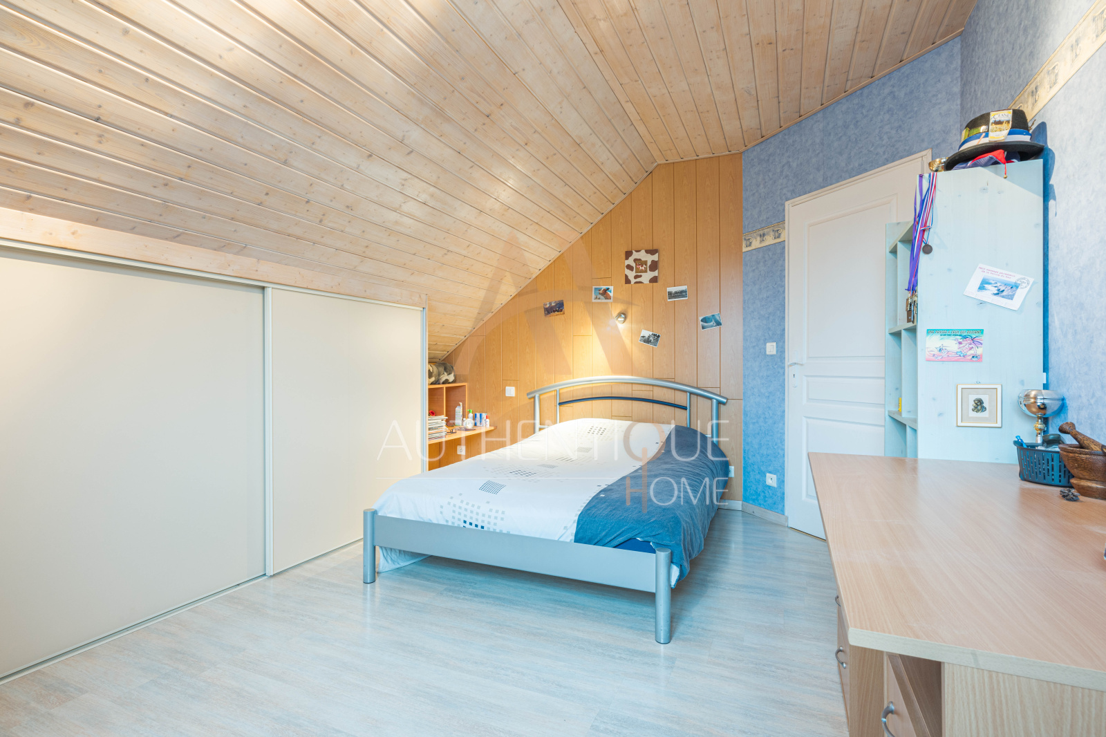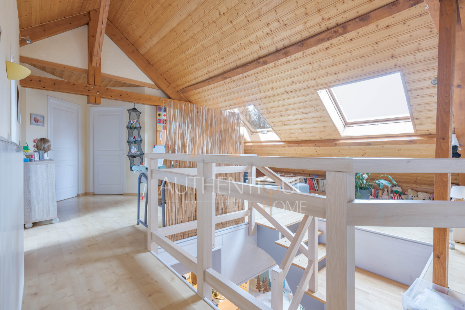 A l'étage, une vaste mezzanine lumineuse et agréable accueille trois chambres et un bureau.