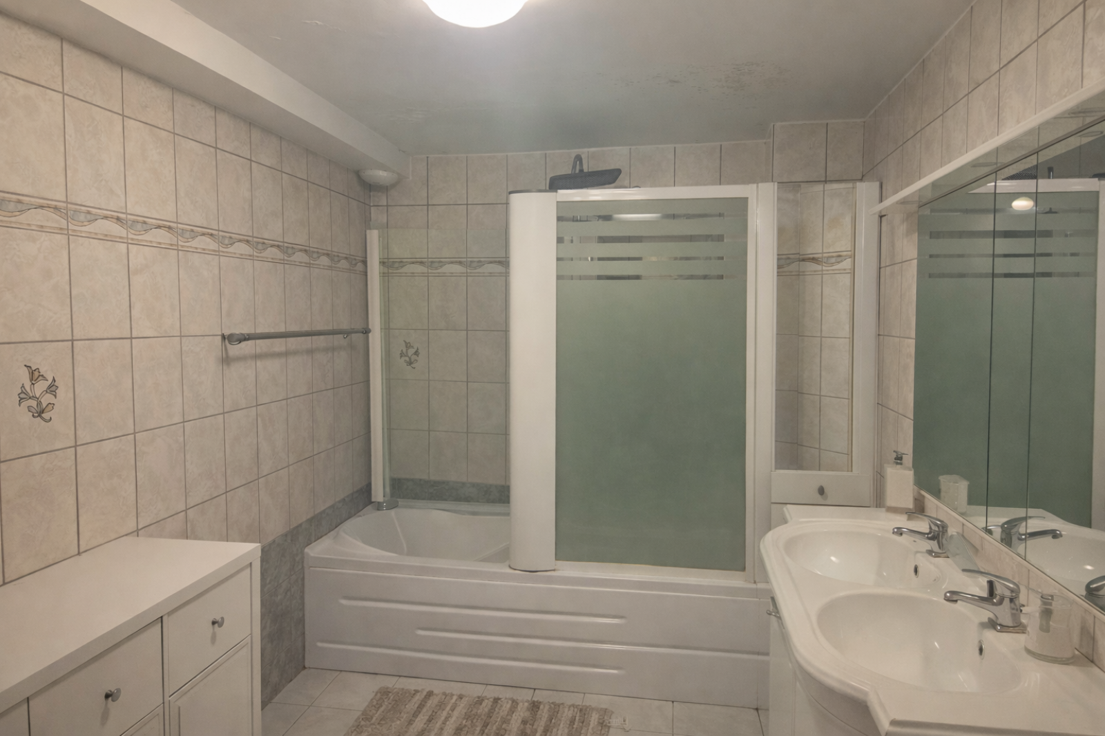 L’appartement dispose également d’une salle de bains avec baignoire (fonction douche) et meuble double vasque, ainsi qu’un WC indépendant.